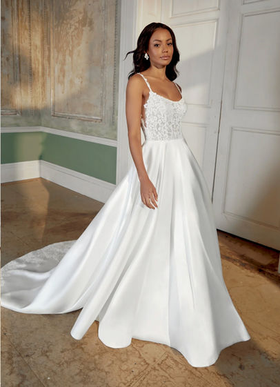 Abito da sposa A-line in mikado con scollo rotondo e delicate spalline in pizzo. Il corpetto trasparente in pizzo cordonato opaco rivela un romantico strato di pizzo Chantilly e sensuali inserti laterali a V. Bottoncini decorano la schiena fino alla zip, mentre applicazioni in pizzo scendono lungo la cucitura centrale e l’orlo dello strascico a cappella.