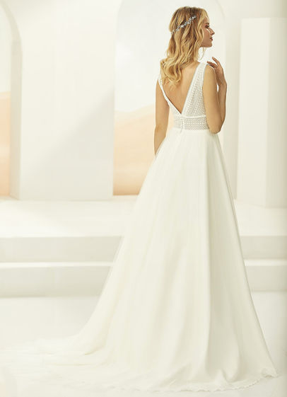 Romantico abito da sposa A-Line in perfetto stile boho-chic, realizzato in pizzo boho e tulle di alta qualità. Lo scollo a V, sia sul davanti che sul retro, esalta la femminilità con delicatezza. La gonna in tulle, leggera e ariosa, con discreto strascico aggiunge un tocco elegante e sognante.