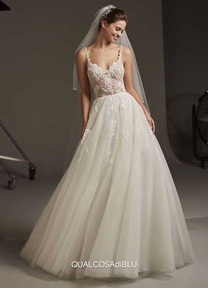 Questo abito in tulle brillante è un capolavoro di sensuale femminilità. Le delicate spalline ultra sottili aggiungono un tocco di grazia, mentre il corpetto semitrasparente con applicazioni floreali accentua la bellezza naturale della sposa. Il design offre un look molto sensuale e sofisticato, perfetto per una sposa che desidera essere elegante e seducente nel giorno più importante della sua vita.