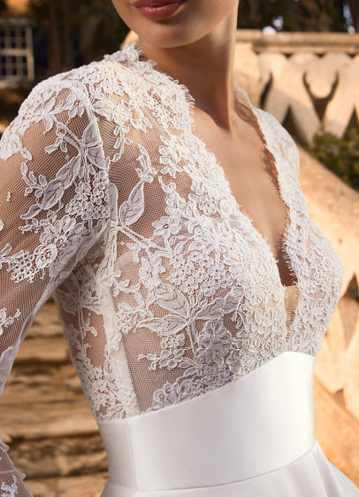 Abito in linea A dallo stile classico che abbina un corpetto in pizzo e uno scollo a V ad una gonna in mikado.