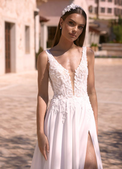 Abito da sposa a trapezio in chiffon e pizzo, con scollo e schiena a V. Stile senza maniche, presenta un girovita naturale e un lungo strascico. Il corpetto è ricamato con dettagli floreali e decorato con motivi in pizzo moderno, che arricchiscono l'intero design con equilibrio.