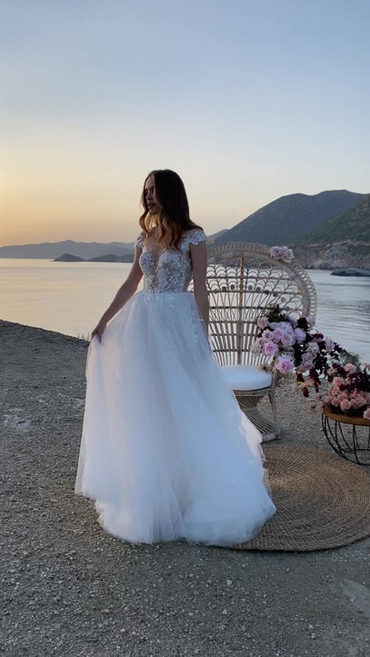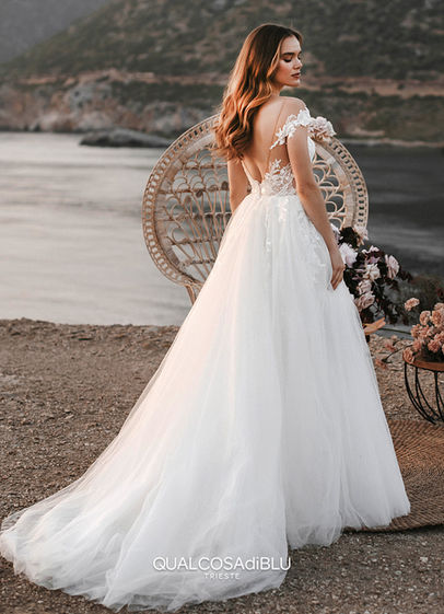 Abito da sposa Milla Nova dallo stile romantico e principesco, caratterizzato da un corpetto in tulle trasparente finemente ricamato con applicazioni floreali in pizzo e perline. Maniche cadenti delicatamente appoggiate sulle spalle. La gonna in tulle ampio e vaporoso scende leggera fino a terra, creando un effetto da vera principessa.