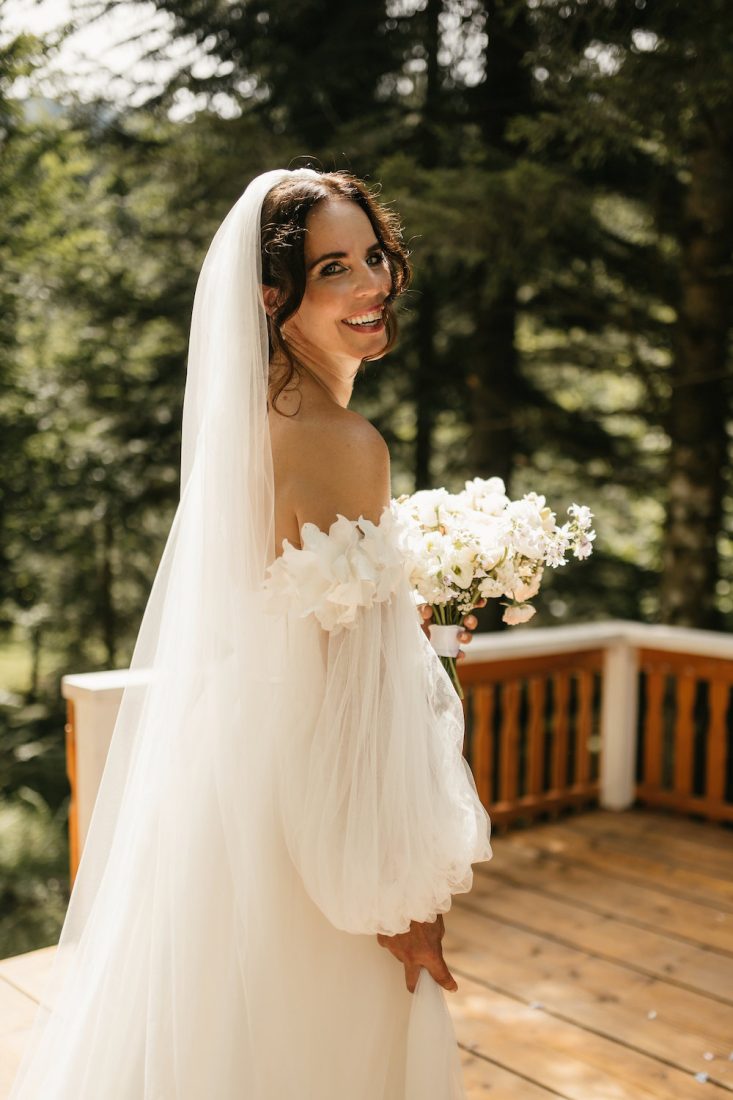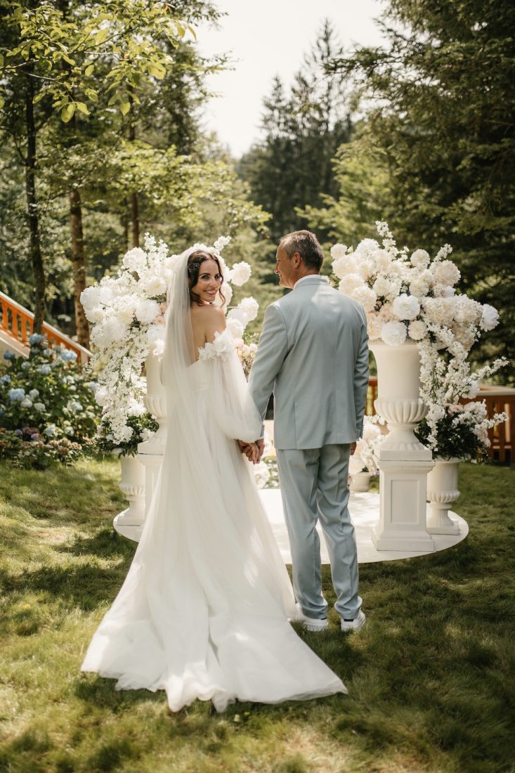 Il primo è stato scelto dalla figlia Sofia, un modello Pronovias. Un abito da fata del bosco, perfettamente adatto allo stile e personalità di Lorella e al tipo di evento. Maniche in tulle trasparenti, fiori sulle spalle, un corsetto che calzava a pennello.