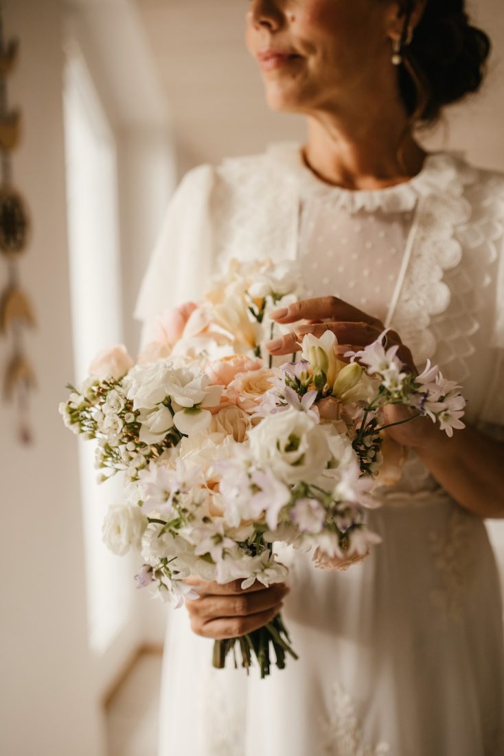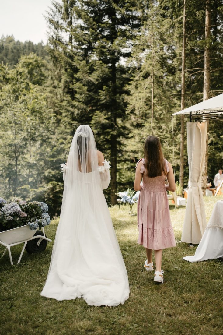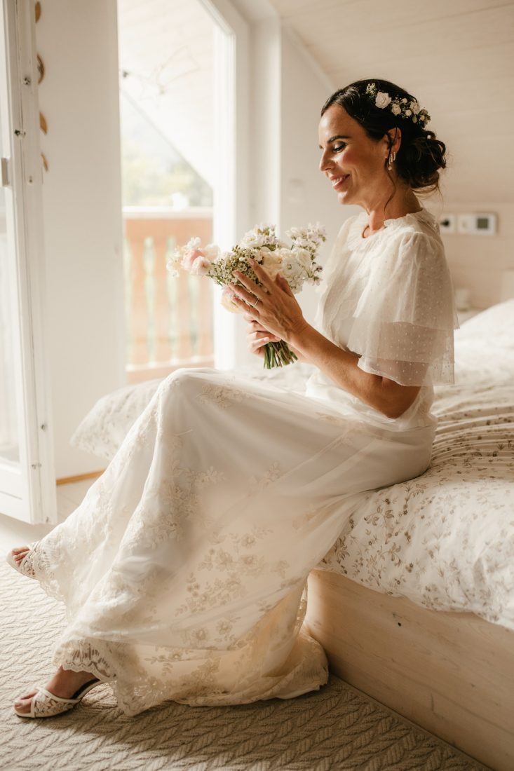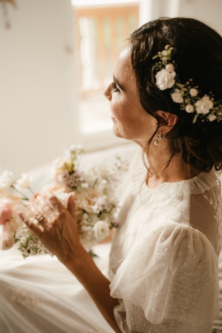 Il secondo abito dallo stile vintage, un modello Rembo Styling, realizzato in pizzo estremamente prezioso, su tutta la lunghezza e anche sulla schiena. Un abito ricercato che rispecchia alla perfezione il romanticismo di Lorella. Tra i capelli una varietà di fermagli con fiori, realizzati su misura, nei colori del matrimonio.